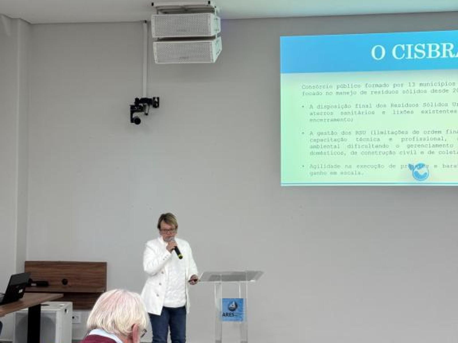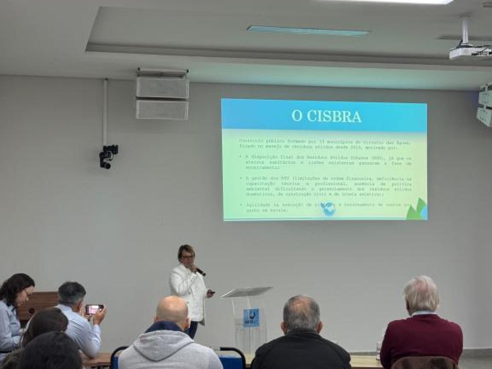 A superintendente do CISBRA, Sandra Dimis, abriu as apresentações trazendo um panorama completo sobre o consórcio, formado por 13 municípios, e os desafios enfrentados na gestão de resíduos sólidos urbanos. Foram apresentados os serviços prestados pelo CISBRA, como a coleta de resíduos domésticos, de saúde, eletroeletrônicos, pneus, volumosos e embalagens de agrotóxicos, além dos projetos de educação ambiental realizados nas cidades consorciadas.
